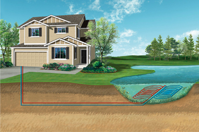 La géothermie est une technologie qui permet de transformer l'énergie emmagasinée dans le sol, les eaux de surface et la nappe phréatique en énergie utilisable pour chauffer et climatiser les bâtiments résidentiels. Un circuit peut avoir plusieurs configurations, mais il en existe trois fondamentales : à la verticale, à l'horizontale et dans un lac (ou un étang).